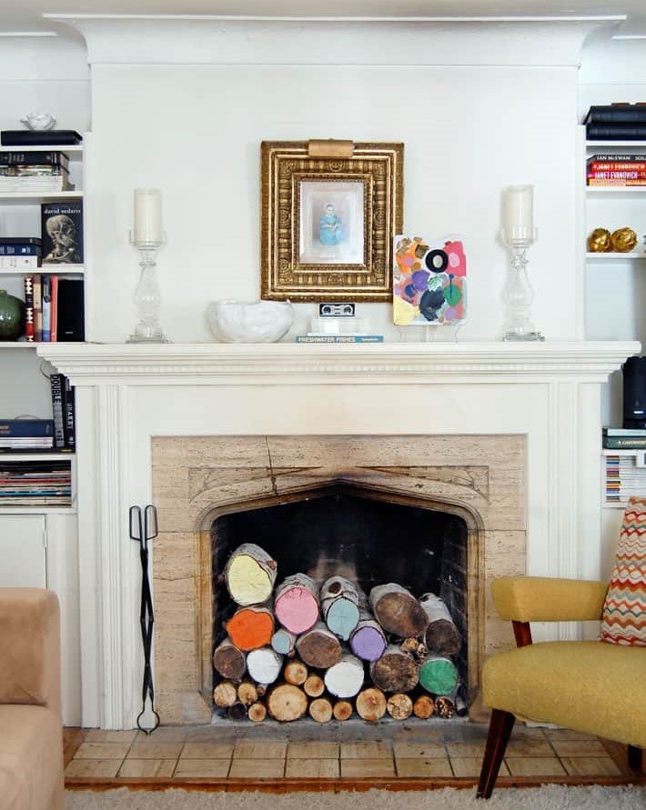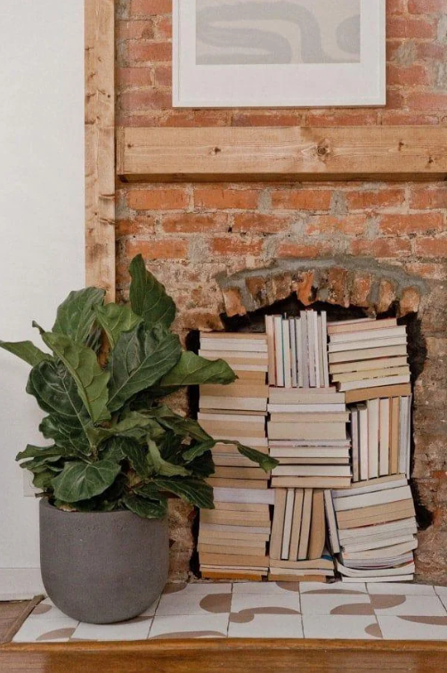 Stack books neatly inside your unused fireplace for a cozy, lived-in feel. Whether arranged by color, size, or theme, this creative storage idea turns the hearth into a stylish focal point.