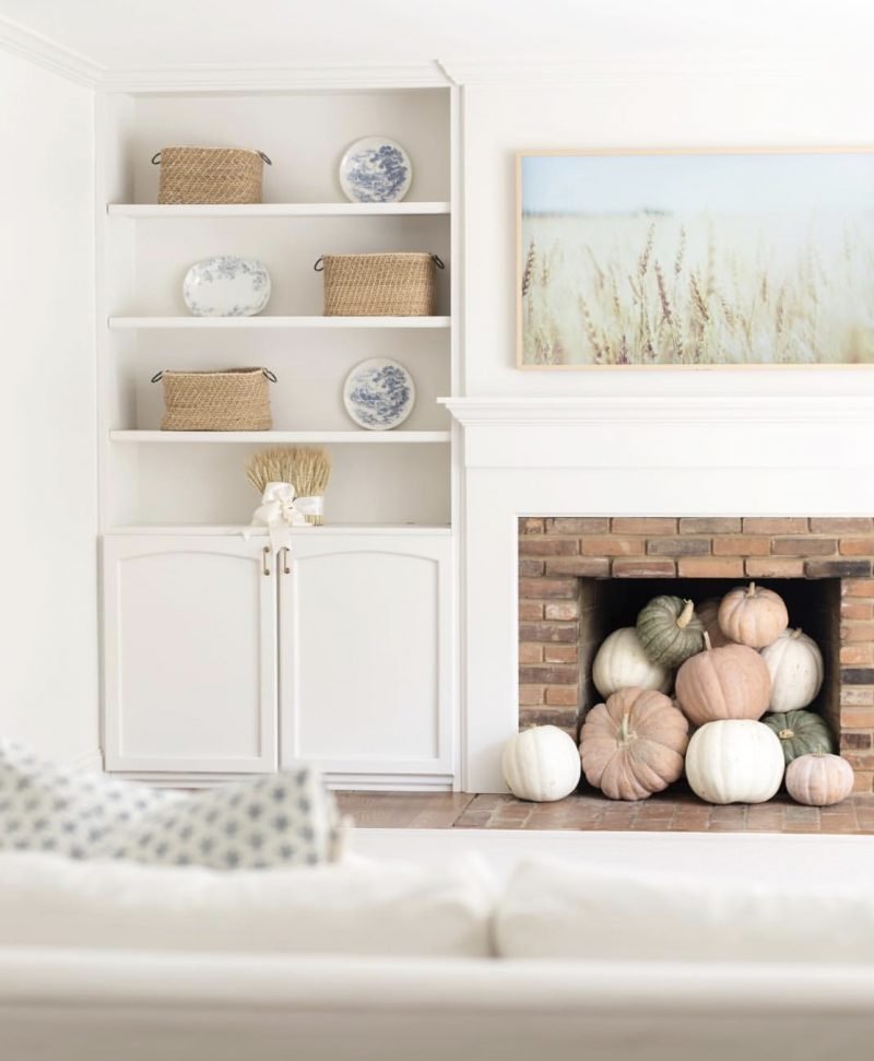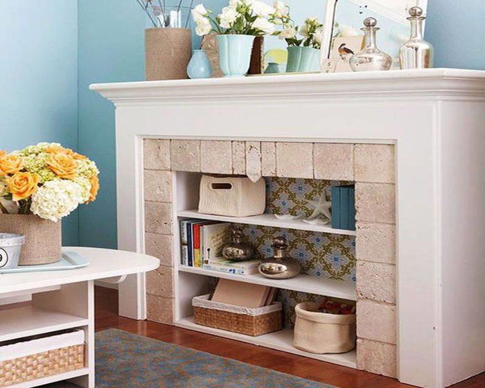Turn an unused fireplace into smart storage by adding baskets, shelves, or stacked boxes. This approach keeps the area functional while adding charm and character to your room’s design.