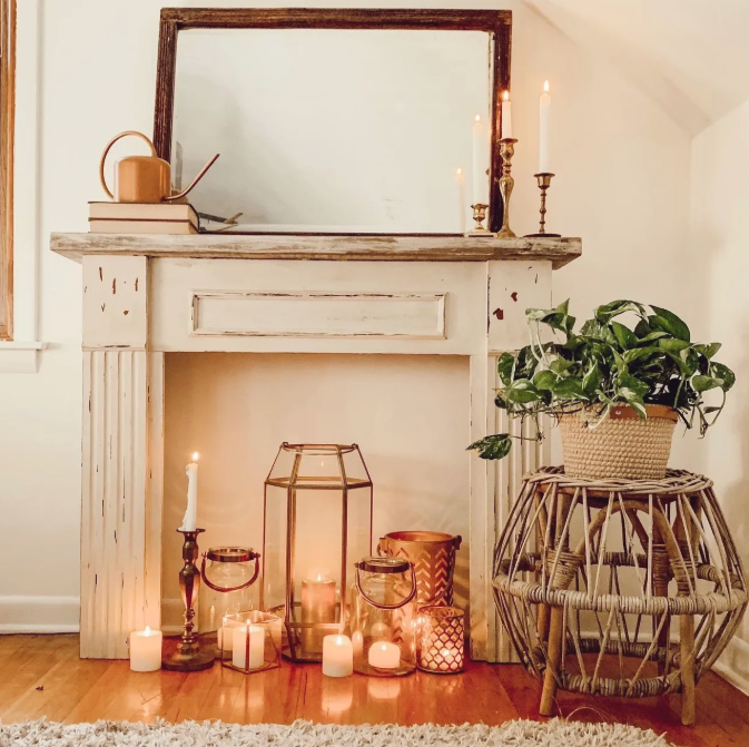 Arrange candles of different heights inside your unused fireplace for a warm, inviting glow. This simple setup creates charm, depth, and a soft light that works beautifully year-round.