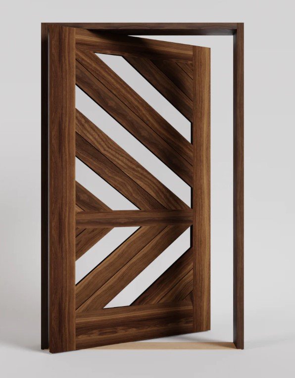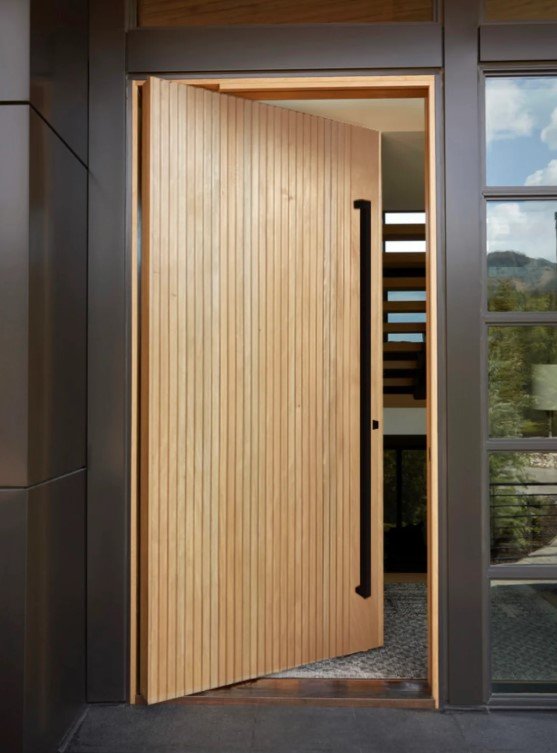 A modern wooden pivot door blends nature and design. The natural texture of wood feels warm and welcoming. Every piece of wood tells a story through its grains and shades.