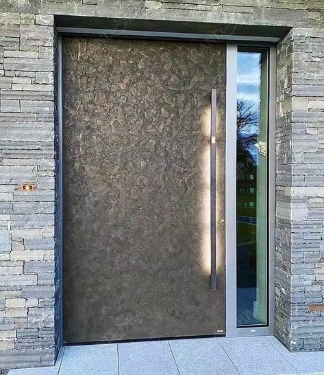 Stone-textured doors suit homes with garden landscapes or modern concrete walls. Their unique patterns make each door one of a kind.