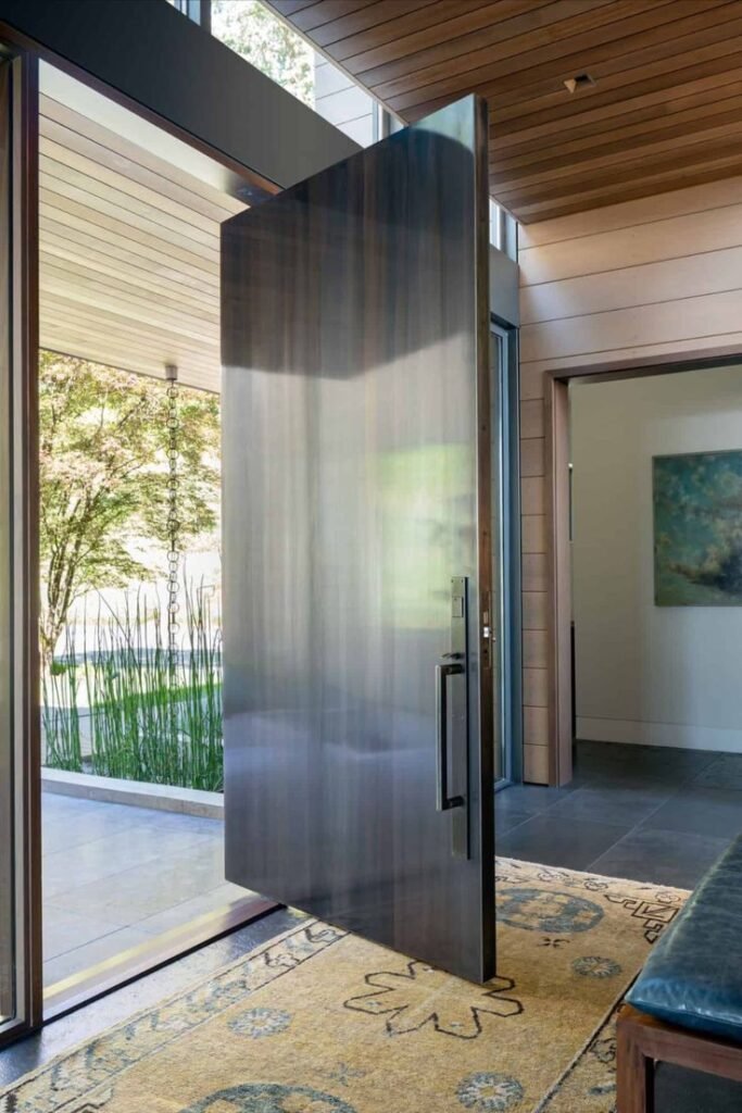 Minimalist design thrives on simplicity. A pivot door with a hidden handle fits that idea perfectly.