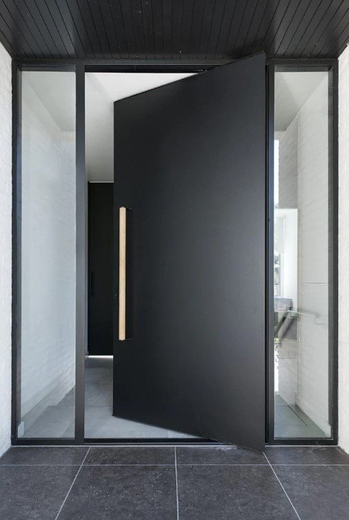 Black aluminum doors give a bold and modern statement. The smooth surface and deep color stand out on light walls. Aluminum is lightweight yet strong, making it perfect for large pivot designs.