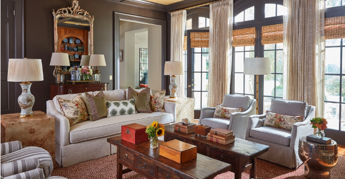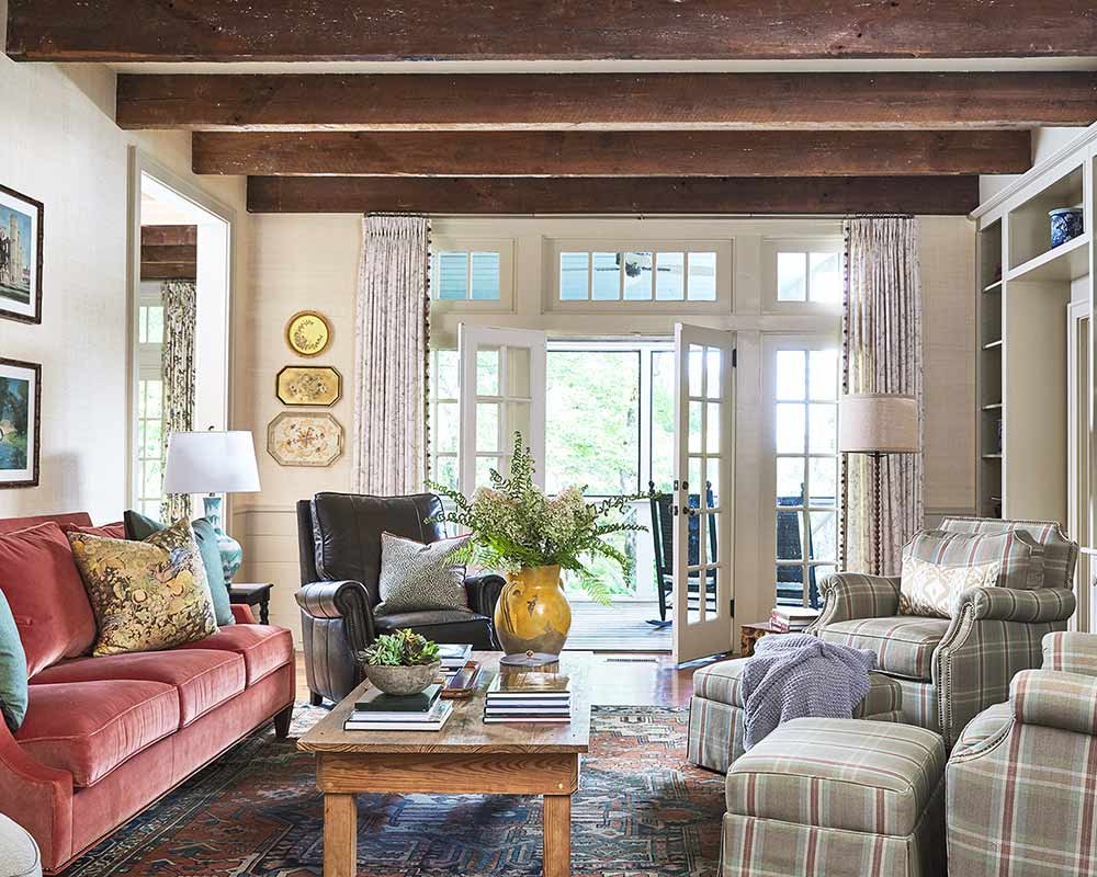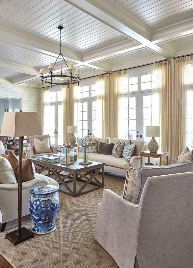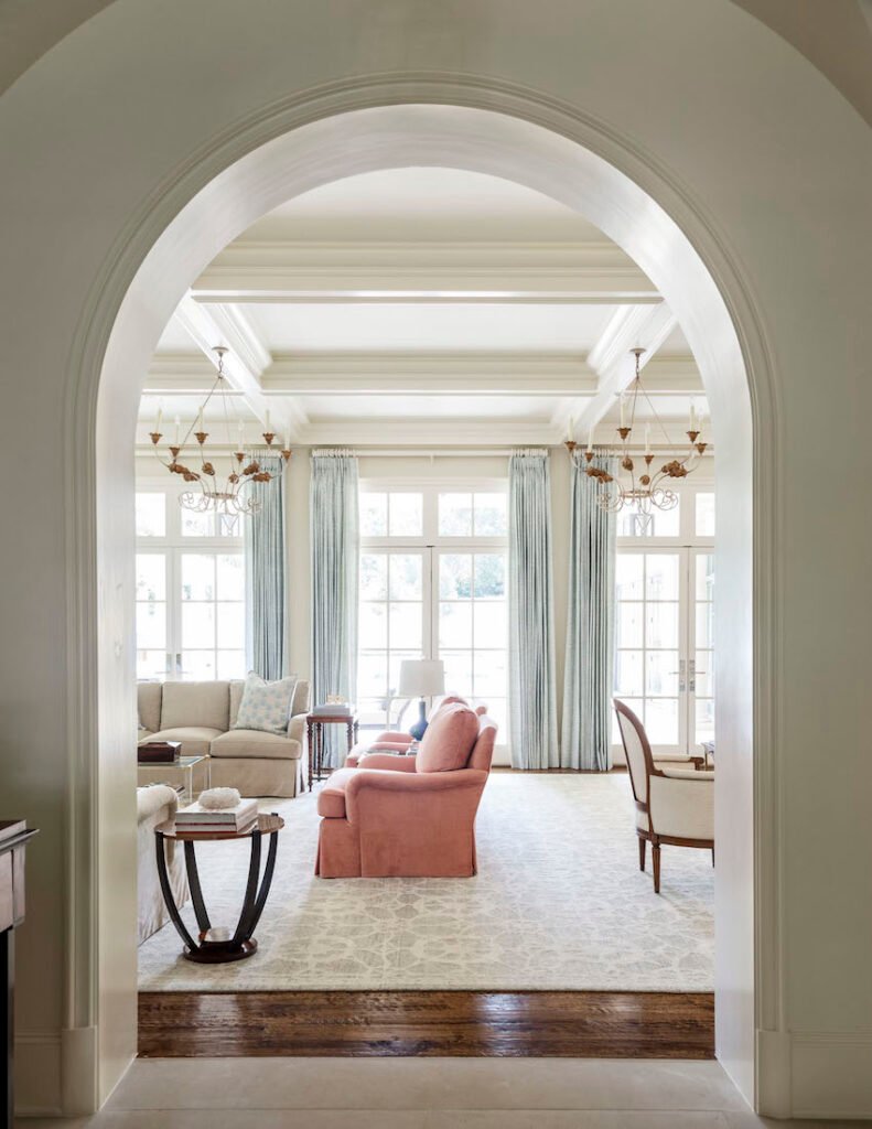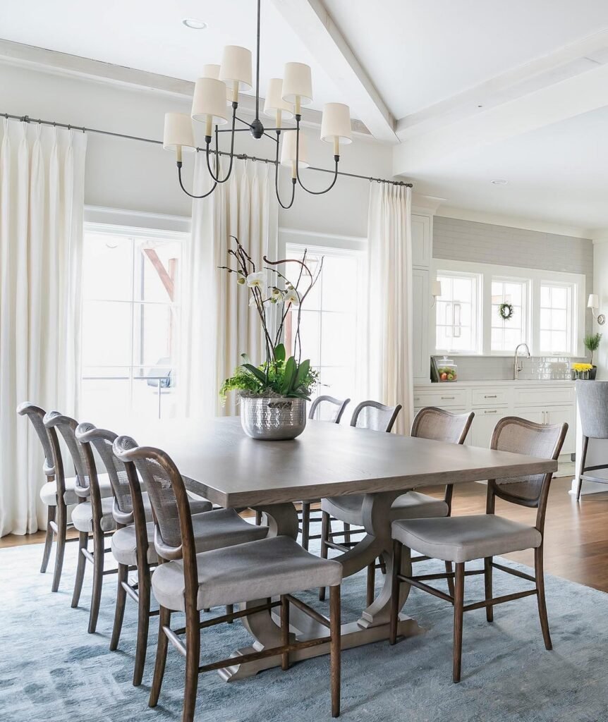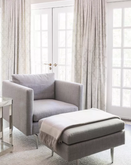 Extend curtain rods higher for a grand, open feel. Floor-to-ceiling panels draw the eye upward, add height to the room, and frame French doors with dramatic style while still allowing natural light to stream in.