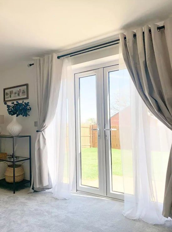 Soft, neutral curtains bring warmth and balance to French doors while letting light flow in. From creamy linens to gentle grays, these hues suit any décor style and create a calm, inviting atmosphere.
