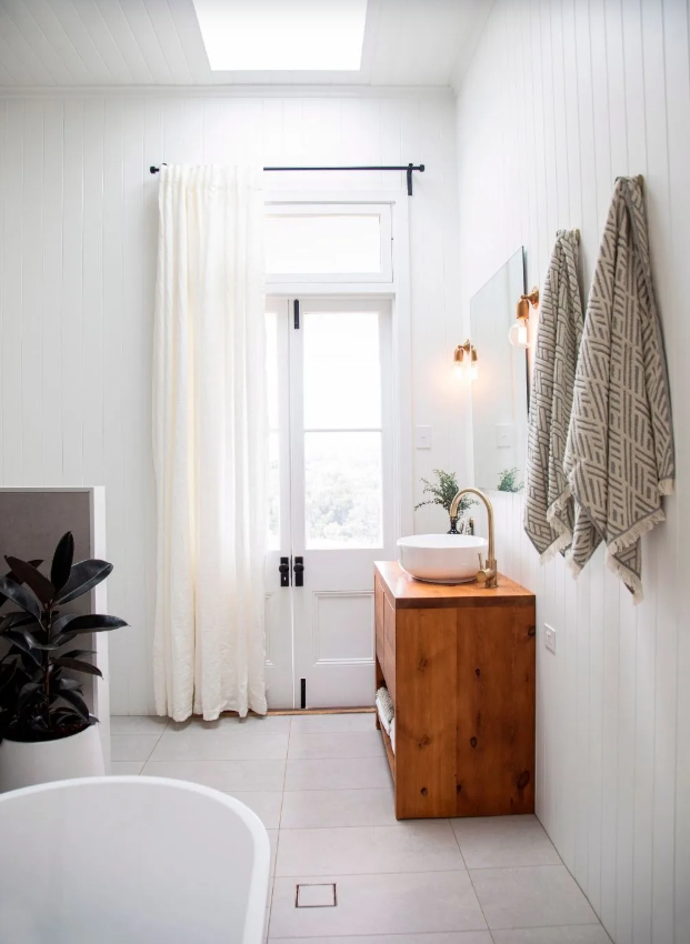 A French door in the bathroom can bring in light and charm while keeping privacy intact with frosted glass or soft curtains. It adds character, brightens the space, and creates a refined architectural feature.