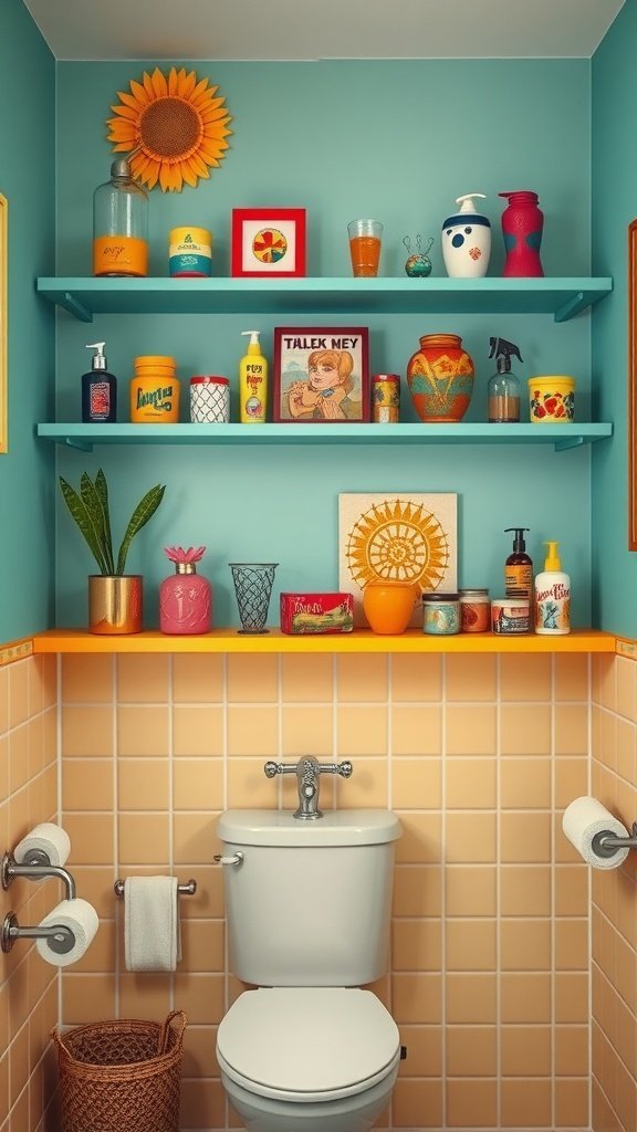The open shelves offer a practical yet stylish storage solution, showcasing decorative items without overcrowding. Each detail, from the patterned rug to the subtle accessories, creates harmony, proving that a well-decorated bathroom can feel like a personal spa.