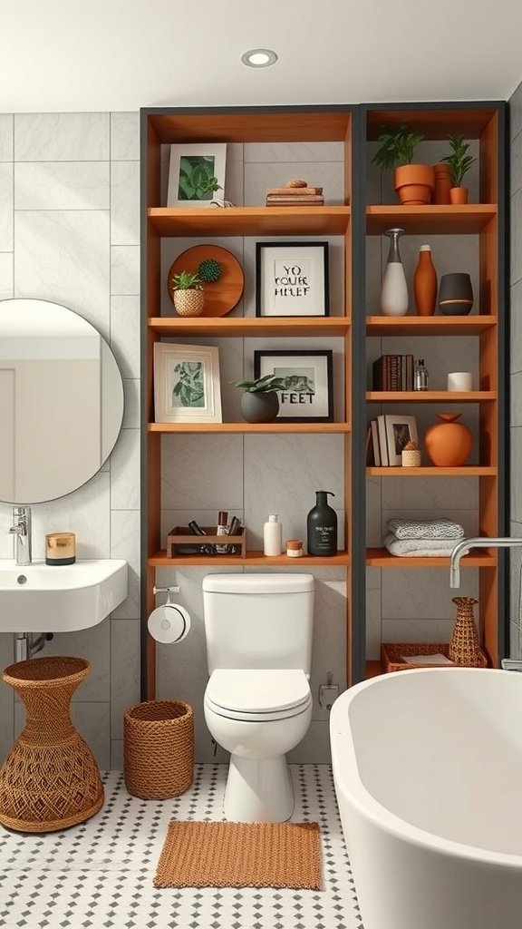 Storage is vital in a bathroom. The open shelving is a smart way to keep essentials handy while maintaining an organized look. Consider incorporating baskets or decorative boxes to create a tidy and inviting space.