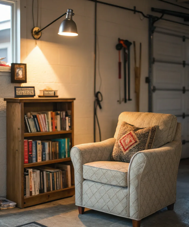 Turn a quiet corner into a small reading nook by repurposing old crates or open shelves for books. Add soft lighting, a comfy chair, and a warm throw to make it inviting. This setup encourages shared reading moments, sparks conversation, and gives your garage or spare room a touch of character and calm.