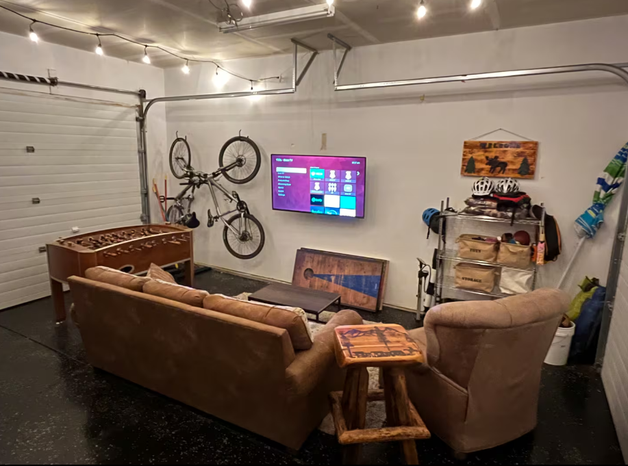 Turn your garage into an entertainment escape by mounting a TV on a swivel arm for flexible viewing. Pair it with a slim soundbar and a smart streaming device to bring movies, music, and game nights to life. This quick setup combines comfort and excitement, making your hangout area the ultimate chill spot for family and friends.