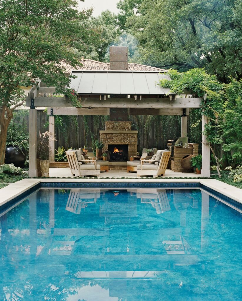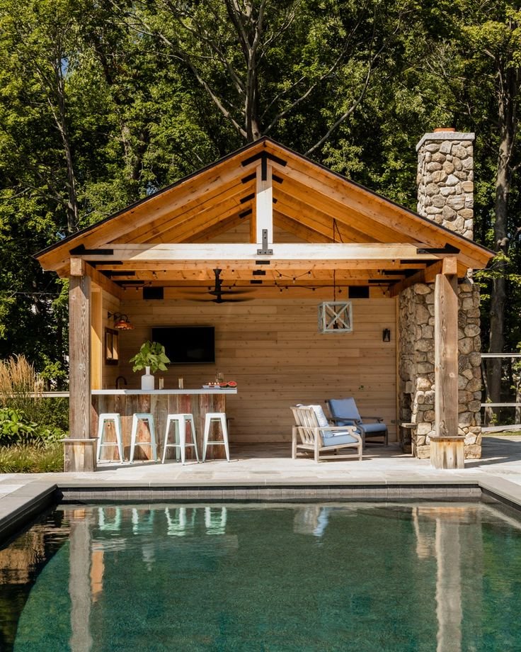 Pair the cabana with stone pathways or a fire pit nearby. This setup makes the pool area feel like a cabin retreat in the woods, even if you live in the city.
