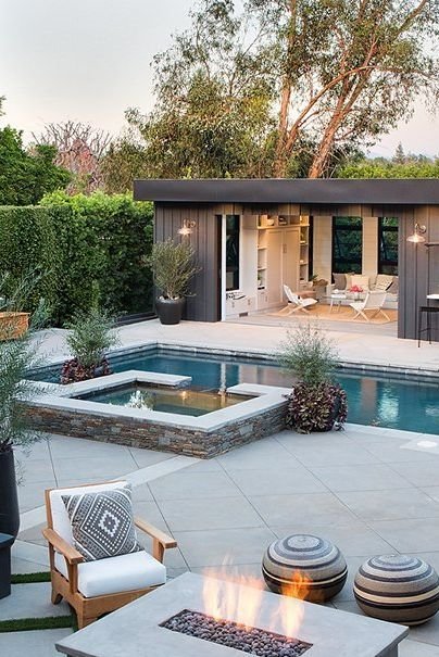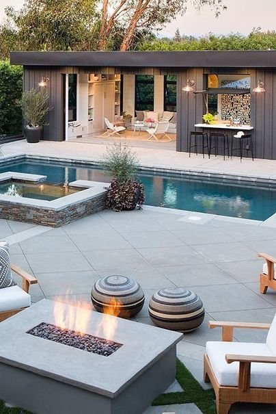This type of cabana works well for year-round use. In summer, it provides shade and style. In winter, it becomes a warm outdoor lounge. With the mix of water and fire, it feels both exciting and relaxing.
