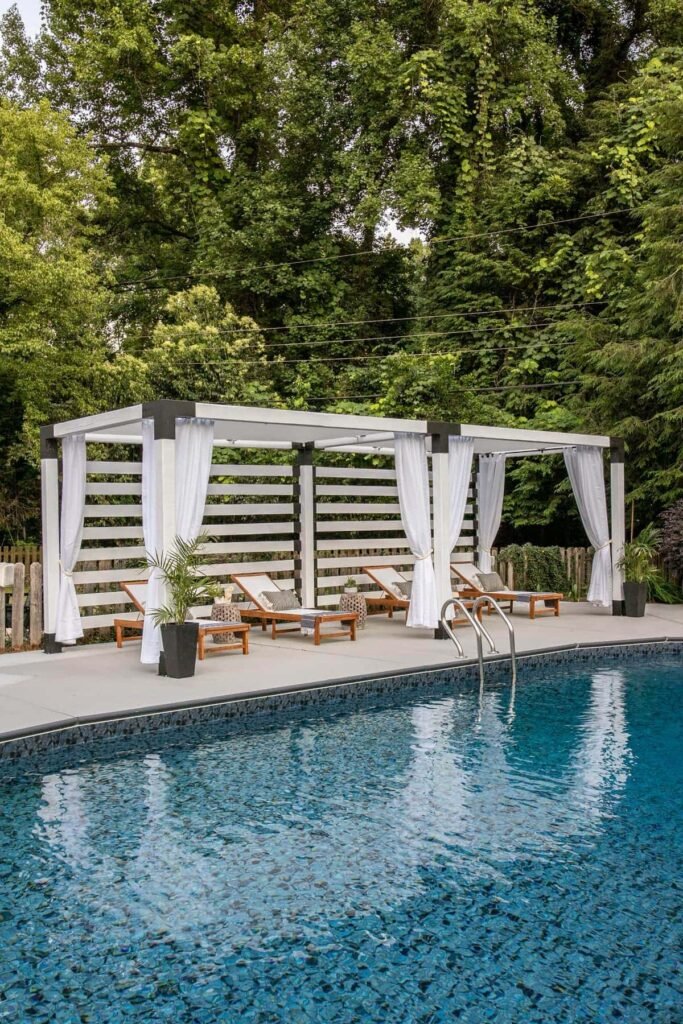 A cabana with daybeds is ideal for anyone who loves resting near the pool. A daybed offers more comfort than regular chairs because you can stretch out fully. This setup feels like a mix between a bedroom and a lounge.