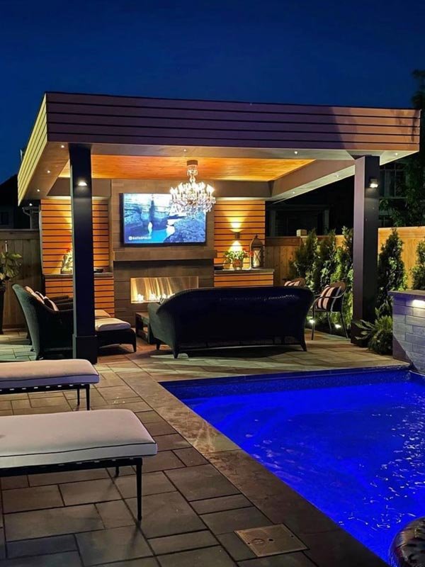 An entertainment cabana combines relaxation with fun. Imagine watching a sports match while kids splash in the pool, or enjoying a movie night outdoors.