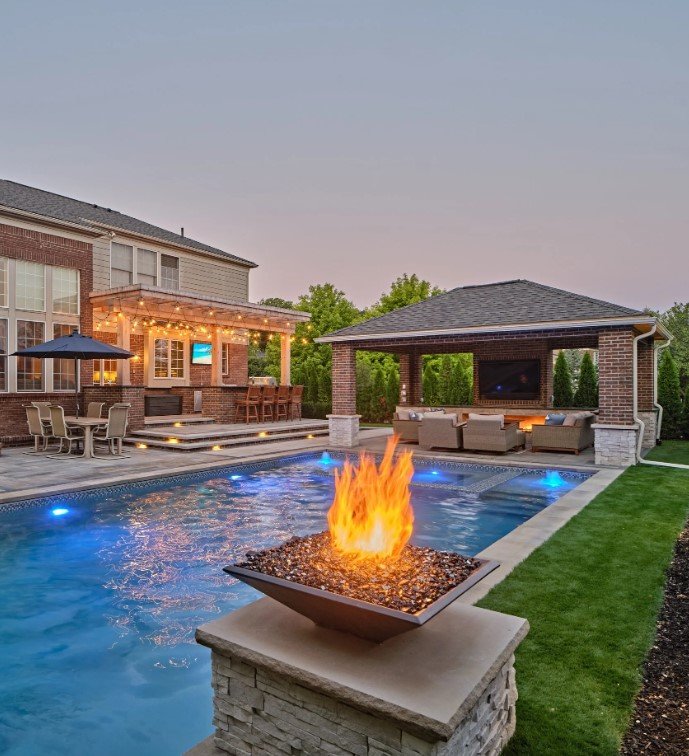 Fire and water together create a dramatic look. A pool surrounded by fire bowls or a fireplace near the kitchen adds warmth and style.