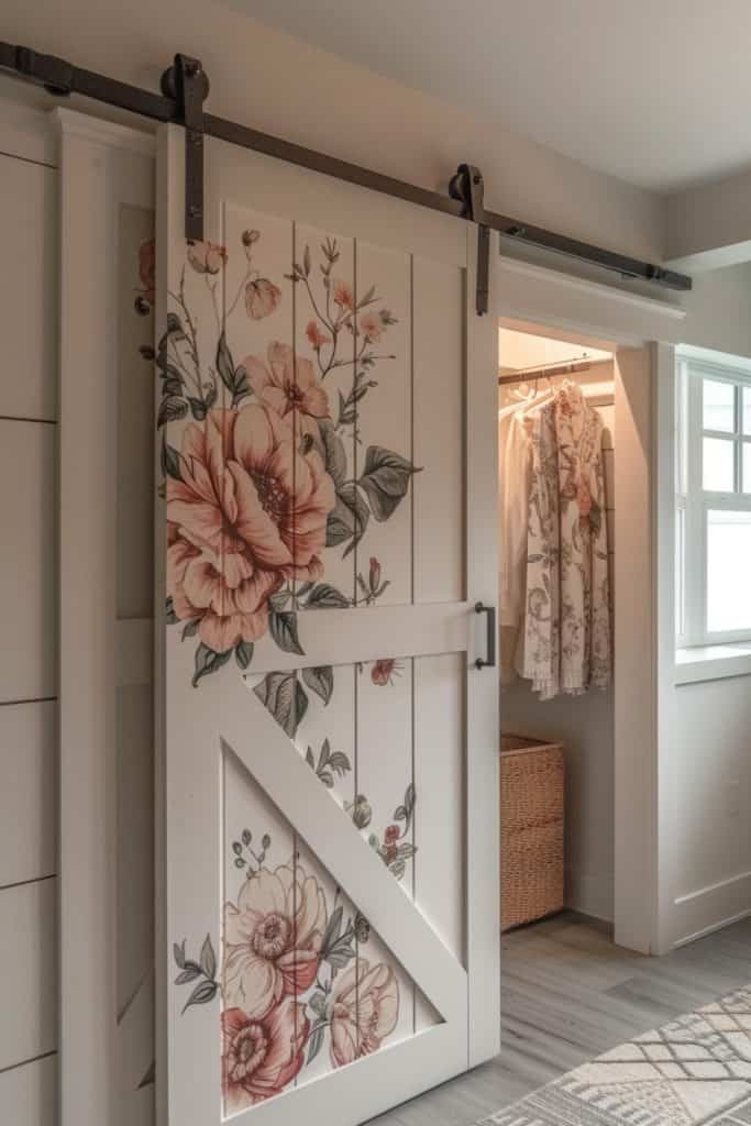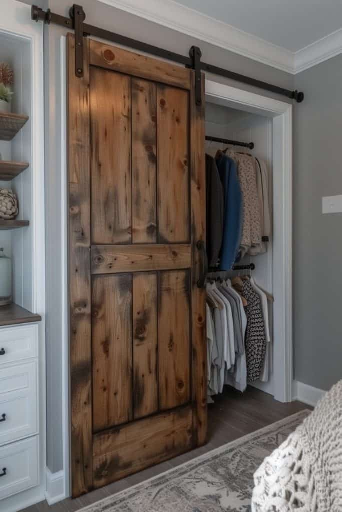 If you want the door to stand out, leave the wood natural and add a clear coat for protection. Dark iron tracks and handles complete the farmhouse look. This option adds coziness and charm while making the closet feel like part of the room’s personality.