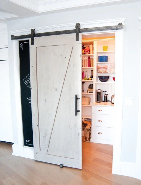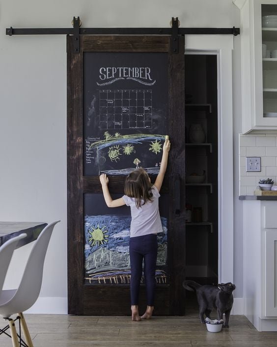 This design works in family bedrooms, home offices with closet storage, or kitchens where organization is key. A chalkboard barn door combines playfulness with practicality.