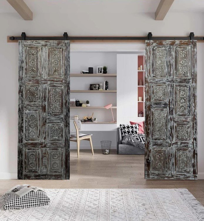 A carved barn door works in a master bedroom, a guest room, or even a hallway where it can be admired daily. It adds texture, depth, and elegance that goes beyond simple function.