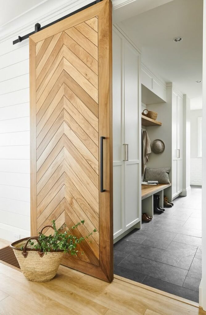 The design can be subtle with similar shades of wood or bold with contrasting light and dark tones. Such doors often become the main feature of the room. Plain walls and simple furniture allow the patterned barn door to shine. This idea is great for people who want their closet door to look like a piece of art instead of just a divider.