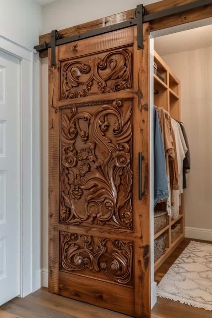 Carved barn doors turn a closet into a centerpiece. Designs may include geometric grooves, floral carvings, or decorative patterns. Some use wood carving, while others add metal inlays for more drama.