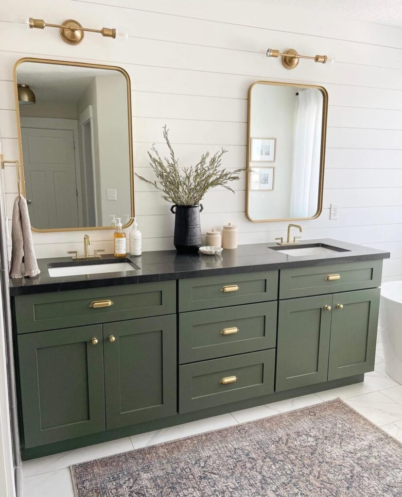 Verdant green cabinets bring a sense of renewal and organic energy to your bathroom. This rich shade channels the freshness of nature indoors, offering a calming yet dynamic atmosphere. It’s a choice that balances vitality with sophistication, creating a space that feels both grounded and refreshing.