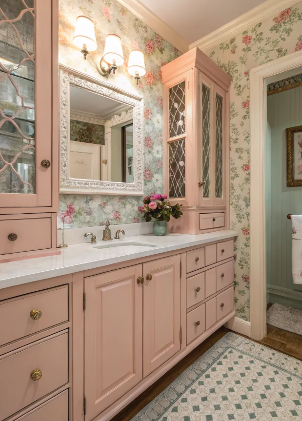 - Delicate Pink Cabinet Finish: Refresh your cabinets with a soft pink finish that introduces warmth and whimsy.