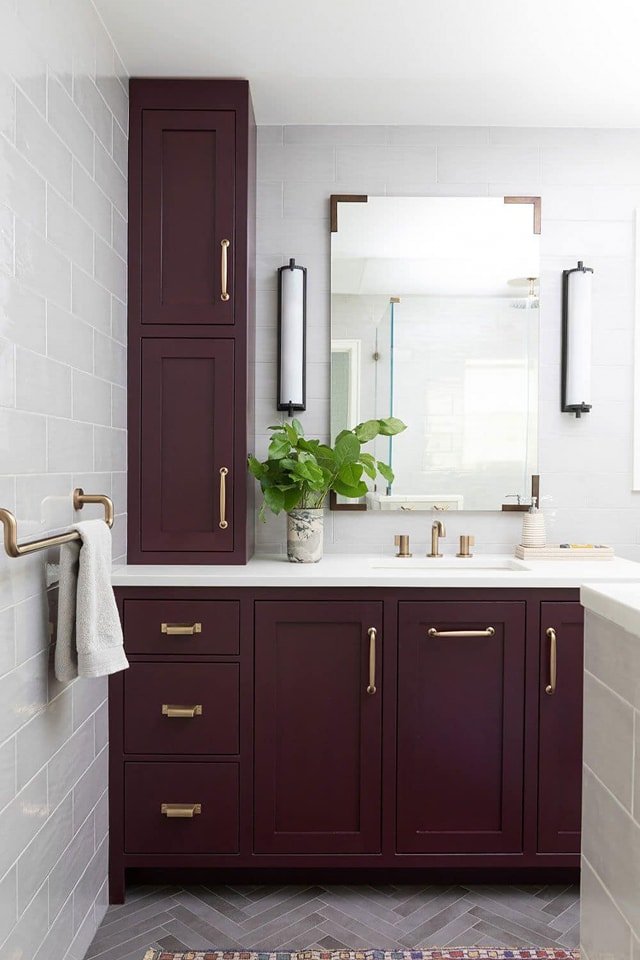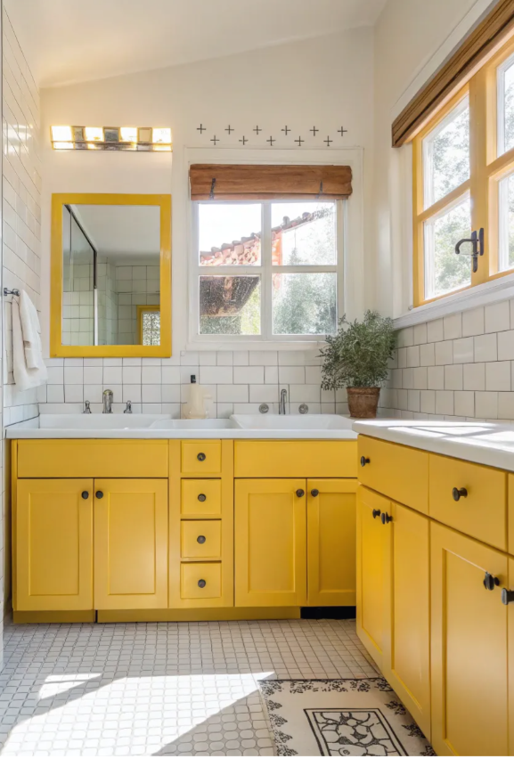 Cabinets in a golden hue bring an uplifting sense of warmth and energy to your bathroom. This radiant shade reflects light beautifully, creating a setting that feels cheerful, modern, and full of character. It’s an ideal choice for those aiming to add brightness and optimism without overwhelming the space.