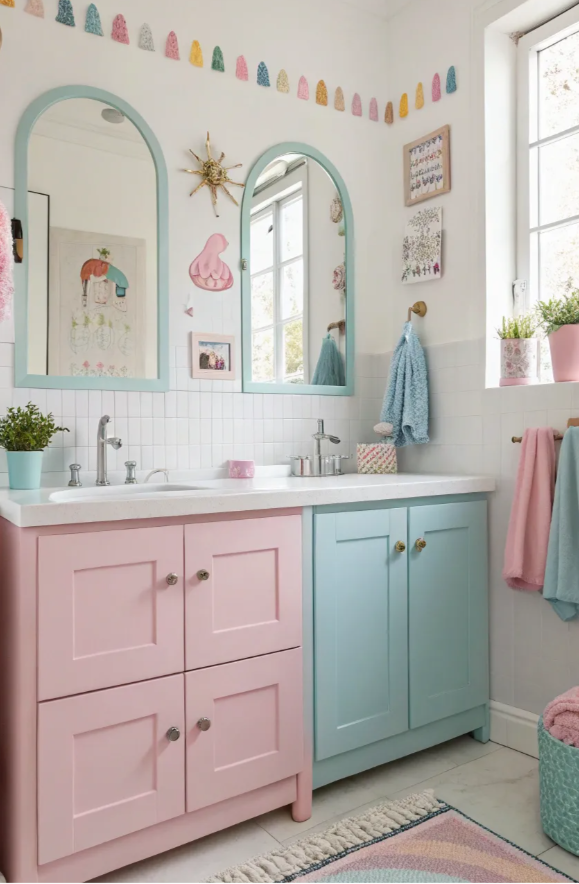 Cabinets in gentle tones like spearmint, blush, or lavender bring a lighthearted charm to your bathroom. These airy shades spark a cheerful atmosphere while keeping the space open and inviting. Perfect for those who appreciate subtle color with a playful spirit, delicate hues add both freshness and personality.