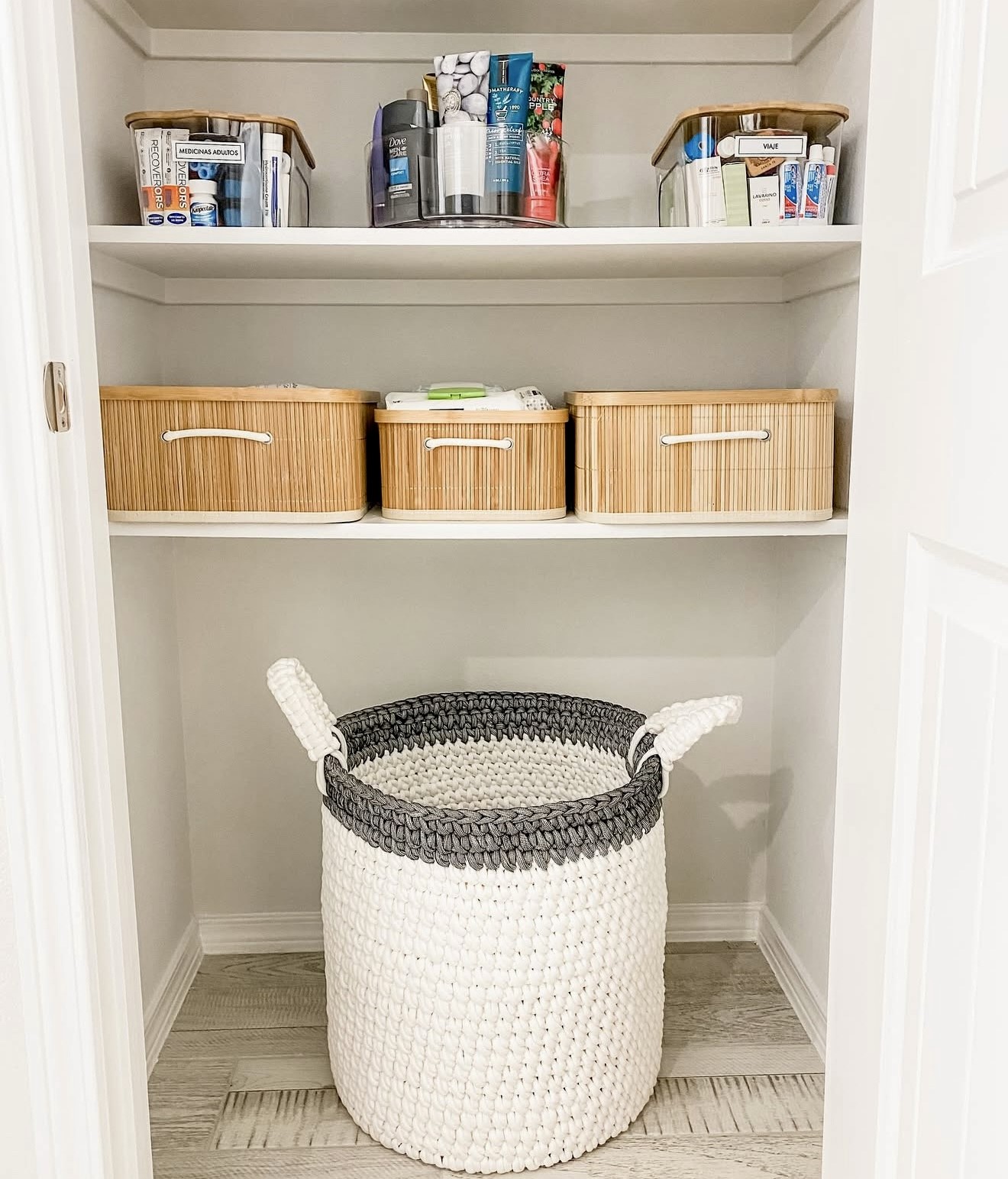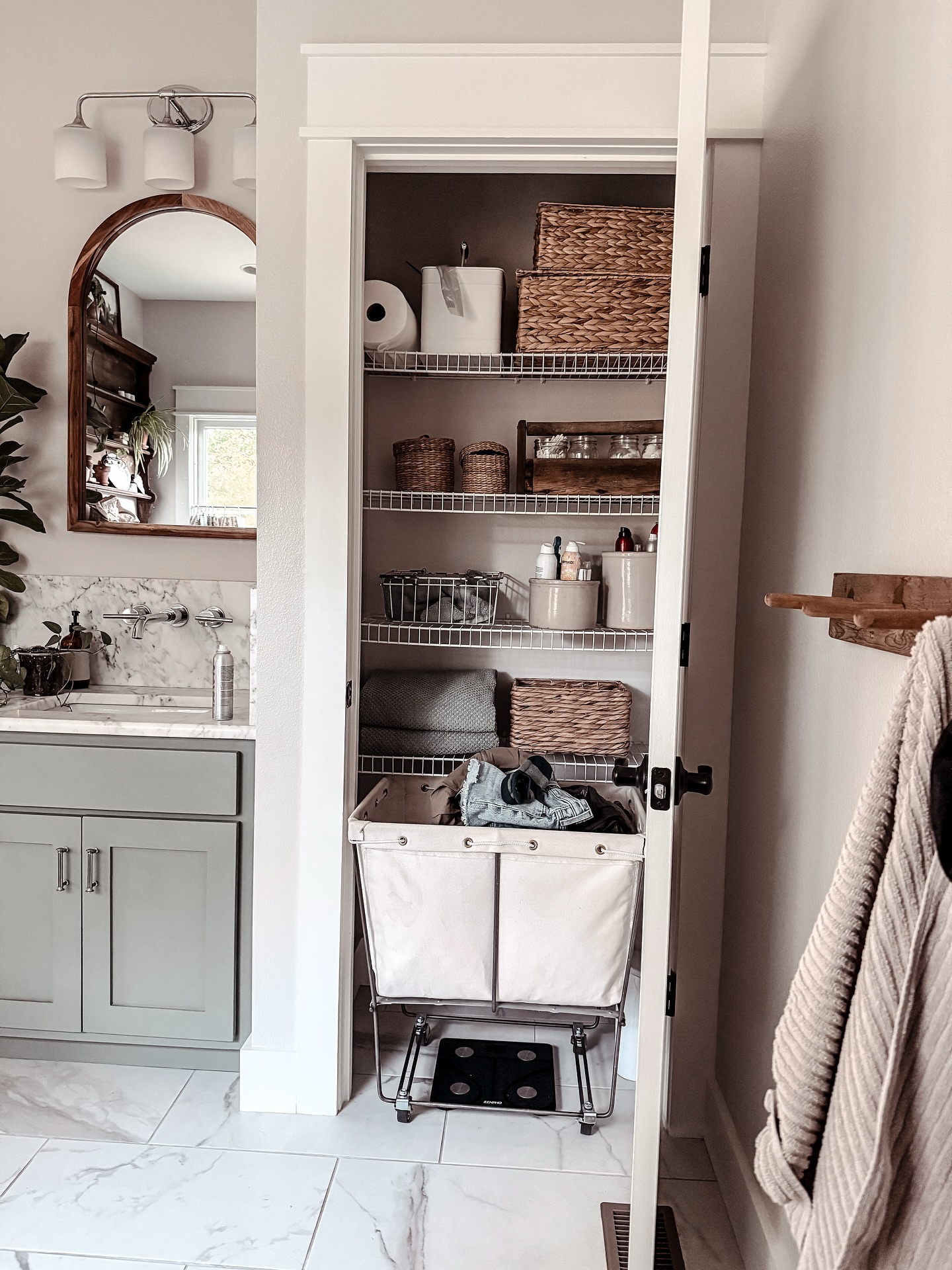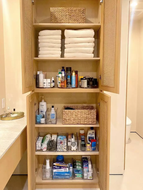 This closet blends soft textures with smart storage, using rolled towels, woven baskets, and clear bins to keep everything easy to reach. Lotions, razors, and smaller essentials stay grouped in acrylic containers, while the baskets add warmth and visual balance. The mix of open shelves and contained storage works well in shared or guest bathrooms, and it’s an approachable DIY for apartment living. The pairing of materials and simple layout creates a calm, polished look that fits perfectly with 2026’s focus on streamlined bathroom organization.