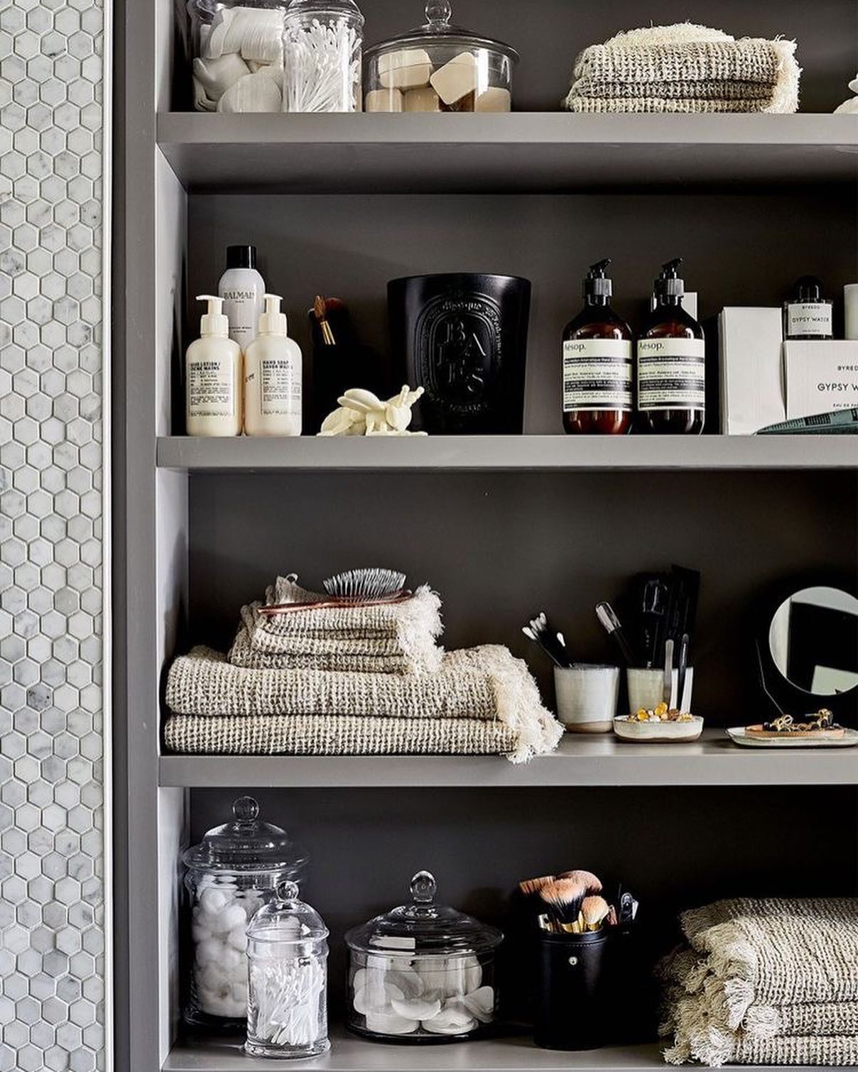 This open-shelf layout leans into rich tones and layered textures, giving the bathroom a refined mood without feeling heavy. Glass jars hold skincare, brushes, and cotton goods, while textured towels and darker accents add depth that feels upscale yet approachable. The setup keeps everyday items within sight in a way that stays orderly instead of crowded. Anyone can recreate this look by pairing clear containers with soft woven linens and a few dark ceramics for contrast. It’s a sharp choice for apartments or guest spaces seeking a hint of luxury with steady function.