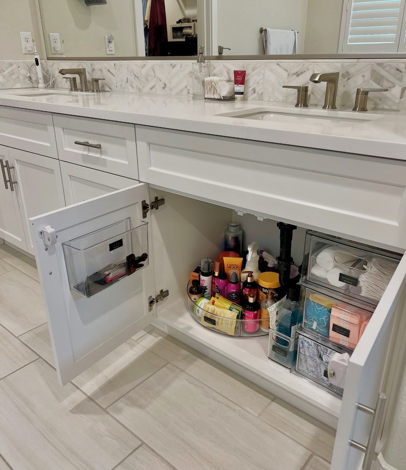 This double-vanity arrangement shows how thoughtful sorting can steady daily routines. Rotating trays, labeled drawers, and compact bins give quick reach to lotions, hair items, and bath supplies. A clear, uncluttered countertop amplifies the modern vibe while keeping everything simple to manage. The layout works well for shared or men’s bathrooms where every inch matters and smooth flow is a priority. It reflects 2026 storage ideas that mix handy DIY tweaks with a clean, polished look.