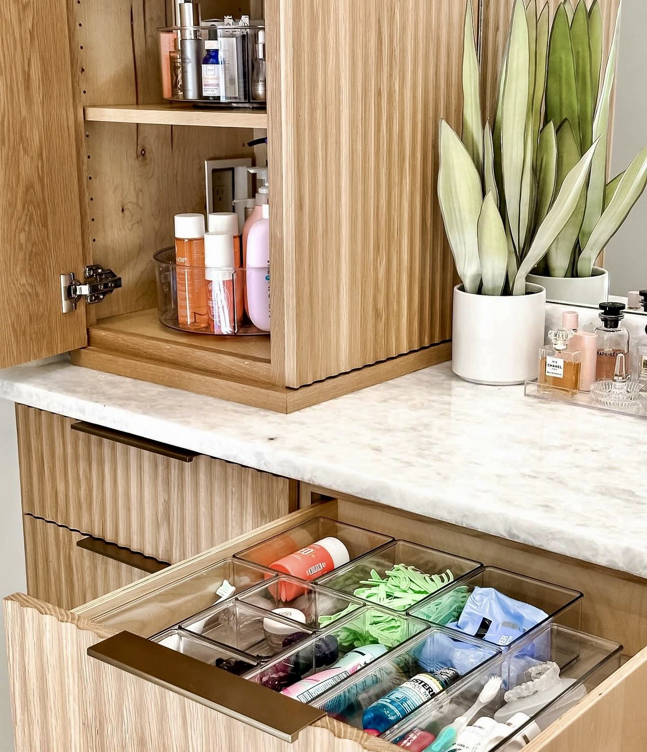 This setup brings calm structure through warm wood tones and clear dividers that split makeup, dental gear, and skincare into tidy compartments. The marble surface paired with a small plant adds a crisp, refreshing note that softens the whole scene. It works especially well for apartments or compact homes, giving straightforward storage without dulling the style. A design-minded DIY choice that keeps daily routines smooth, appealing, and easy to maintain.