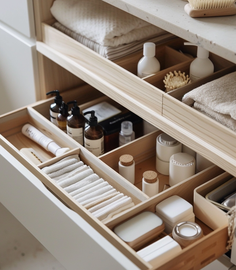 This setup leans on light wood tones and simple compartments to create a calm, orderly drawer. Small bottles, folded towels, and cork-topped jars sit neatly in soft dividers, adding both ease and structure. The under-sink area makes use of shallow boxes to keep items sorted, showing that even tight spaces can look intentional and smooth. It’s a balanced blend of function and style, well suited for modern homes or minimalist apartments, turning everyday organization into a steady routine.