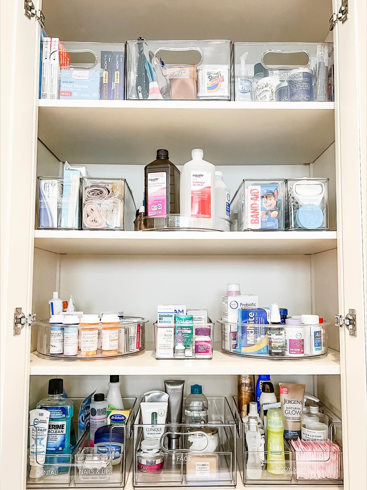 This cabinet blends wellness and order through labeled containers for medicine, skincare, and daily care items. Lazy Susans and small bins keep everything easy to reach, cutting down on clutter and helping even tight spaces stay organized. The setup works well in dorms, apartments, or guest bathrooms and can be assembled with simple DIY steps. Using consistent labels ties the look together, turning a practical storage zone into something clean and visually steady—great inspo for refreshing bathroom organization in 2026.