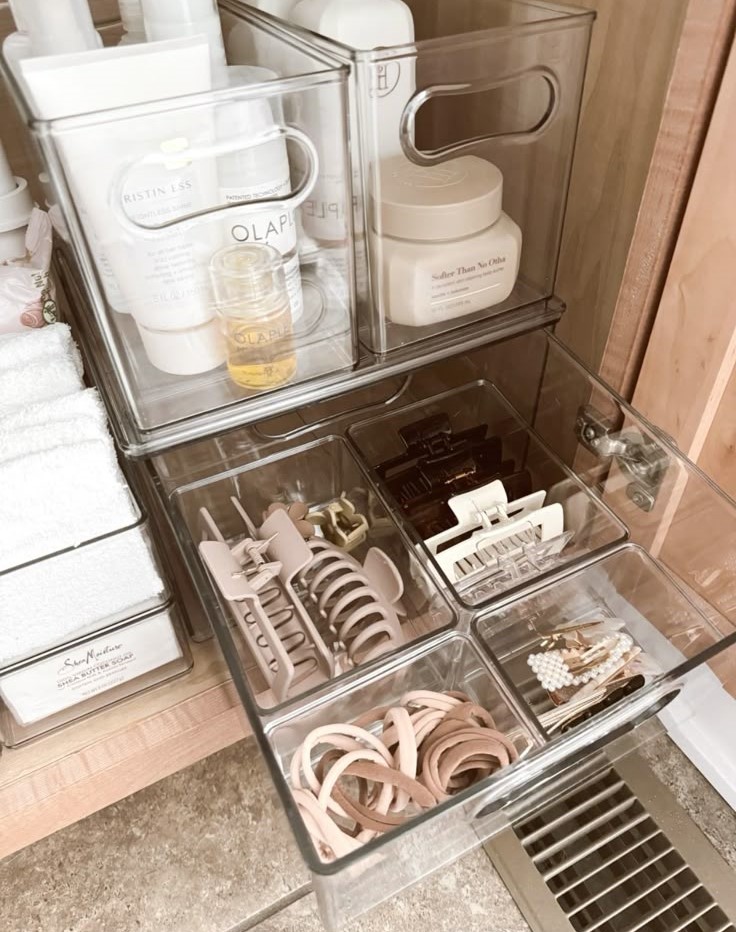 A neatly arranged vanity drawer like this brings calm and clarity to morning routines. Clear dividers separate makeup, skincare, and cotton pads, forming a layout that looks good and works smoothly. This style fits well in apartments or dorms where space matters, keeping items visible and sorted so getting ready feels steady instead of rushed. It’s a simple organization trick that instantly levels up countertop and drawer storage.