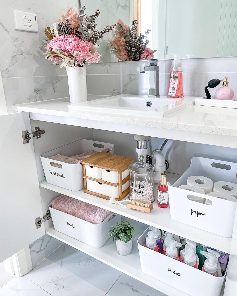 This under-sink arrangement blends clarity with steady function. White bins with clean black labels hold towels, soaps, and paper goods so the area stays uniform and easy to scan. A touch of bamboo brings gentle warmth to a space that might otherwise feel stark, giving the bathroom a soft, spa-leaning vibe. It works well for compact homes or apartments where clever storage under the sink can shift the whole routine. Each element contributes to a calm, curated feel that fits 2026 bathroom organization trends.