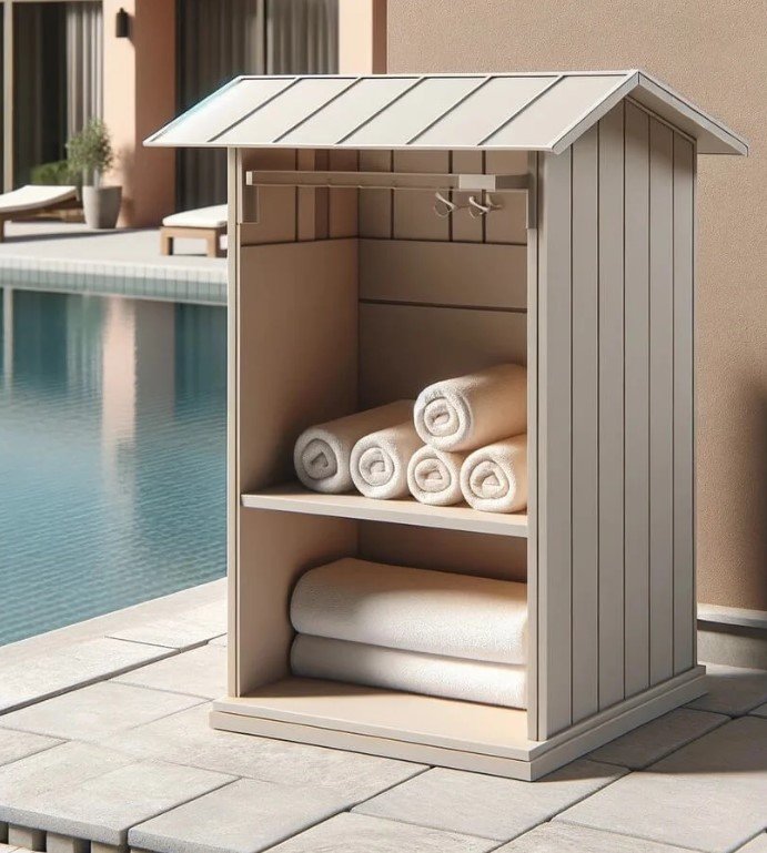 Use waterproof materials like marine-grade wood or composite. Inside, add shelves or cubbies for neatly folded towels. The top can double as a counter for drinks or pool accessories.