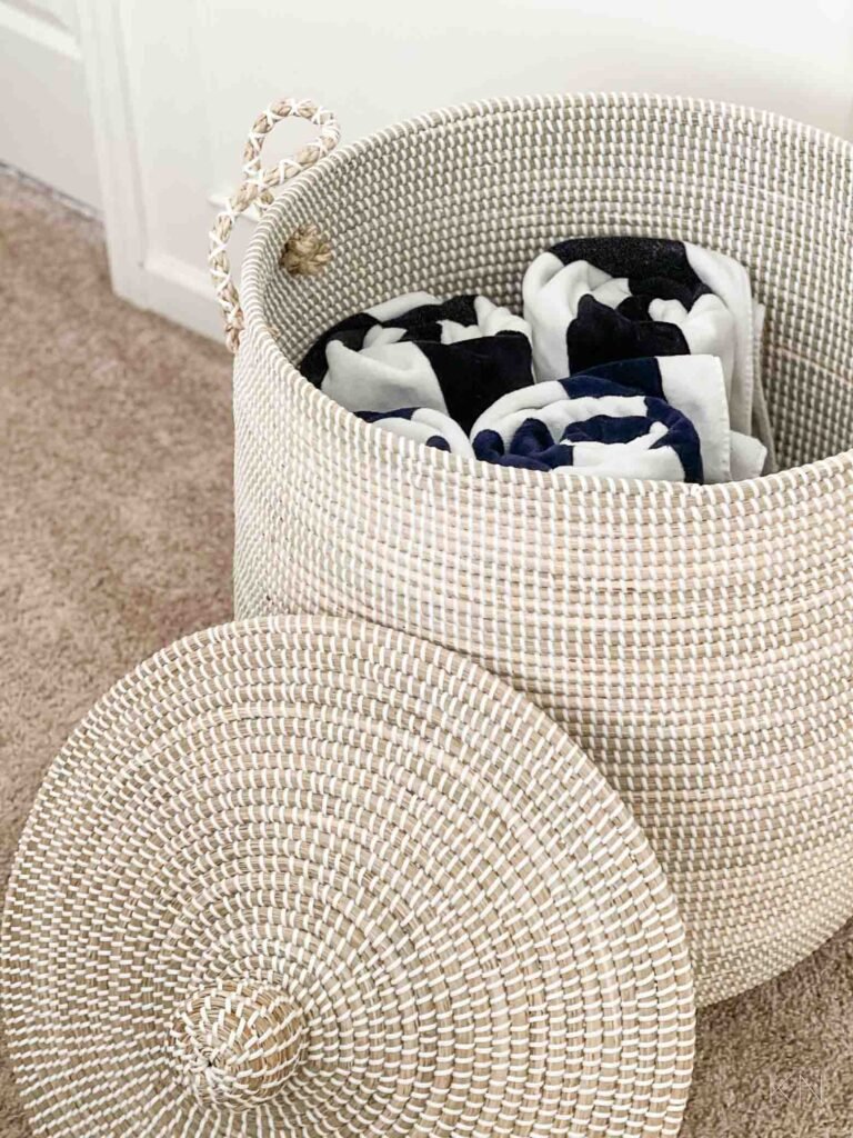 Wicker baskets bring a cozy, coastal feel to your space. They are great for rolled or folded beach towels and blend well with summer décor.