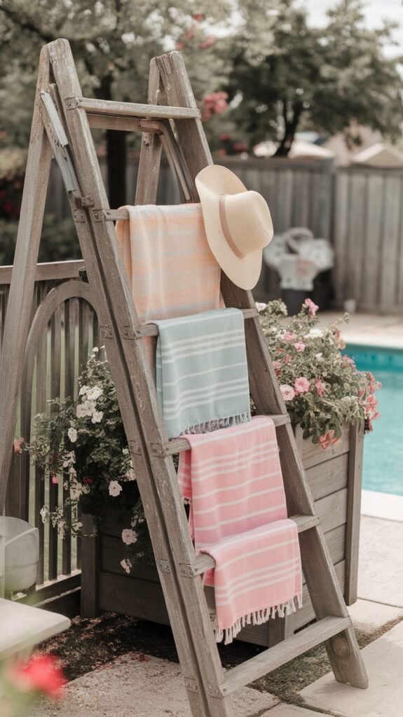 A ladder rack adds instant charm and practicality. Lean it against a wall and drape towels over the rungs. The open design lets air circulate, so towels dry faster.