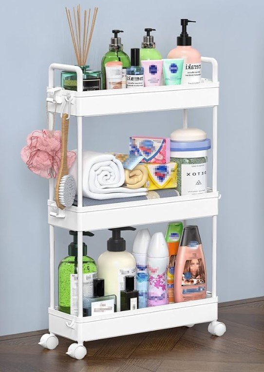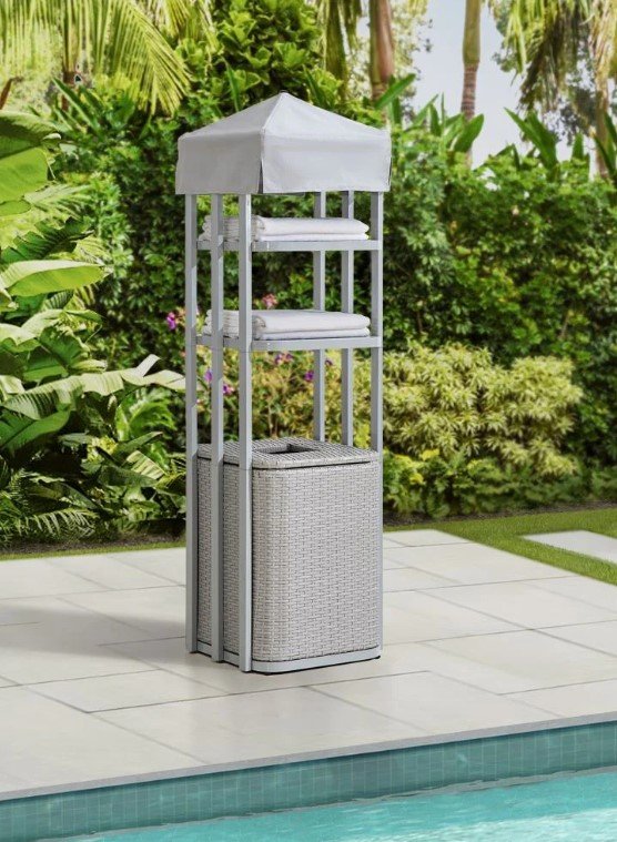 Organize towels on each shelf, with room for sunscreen and snacks on the top. Metal or plastic carts resist water and are simple to clean.