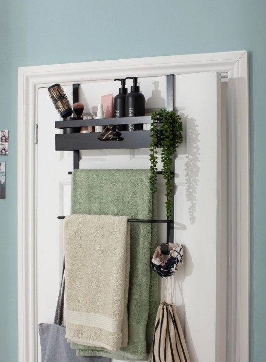 Doors offer unused space that’s ideal for storage. An over-the-door rack keeps towels within easy reach without drilling holes or taking up floor area.