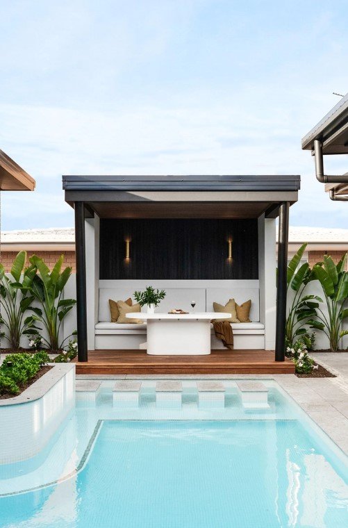 A built-in cabinet near the pool keeps towels dry and organized year-round. This option works best for those who spend lots of time outdoors.