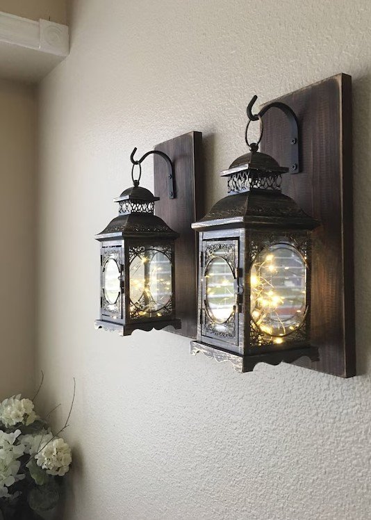 Wall-mounted lanterns add cozy farmhouse charm. Lanterns with black iron, rustic wood, or glass designs create a welcoming glow. Use them with candles or battery-powered lights for safety.