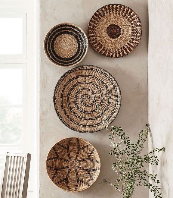 Hanging baskets is a creative and affordable wall décor idea. Woven textures bring warmth and a natural feel to any space. You can hang one large basket as a statement or group several in different sizes and shapes.