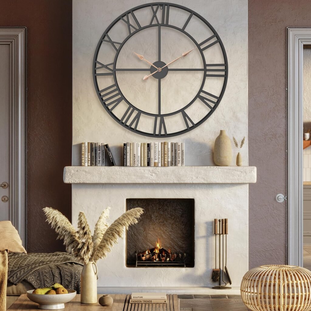Oversized clocks are both stylish and practical. A farmhouse clock often has wood or metal frames, roman numerals, and distressed finishes. Hang one in the living room, dining room, or kitchen to serve as both art and function.