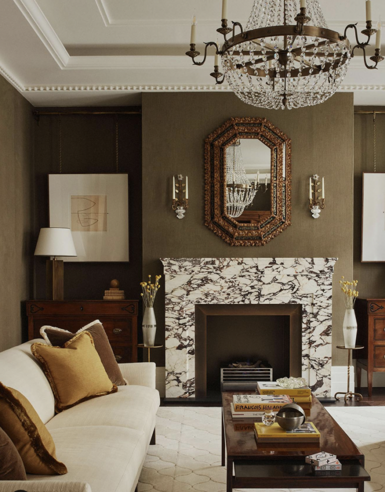 Blend earthy warmth with refined elegance in a brown living room anchored by a marble fireplace and mirror. Rich chocolate and caramel tones pair beautifully with the cool sheen of marble, creating a space that feels grounded yet elevated. A mirror above the fireplace adds brightness and visual depth, reflecting light and expanding the room’s sense of space. Combine wooden textures, gold accents, and plush fabrics for balance, and layer subtle lighting to amplify comfort and sophistication in your living area.