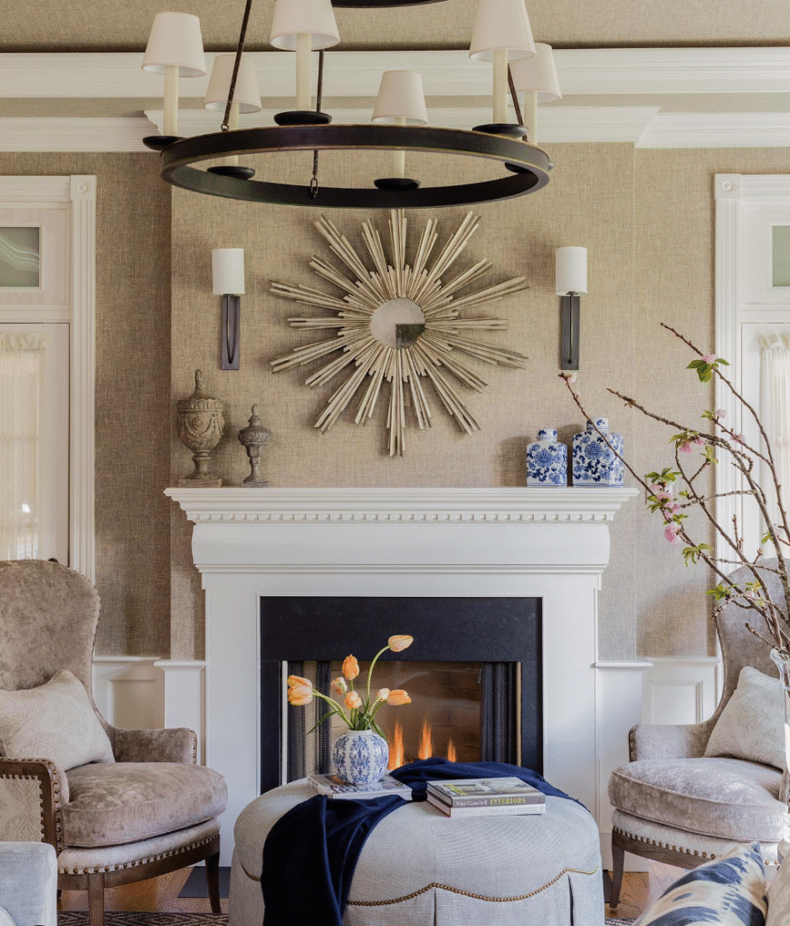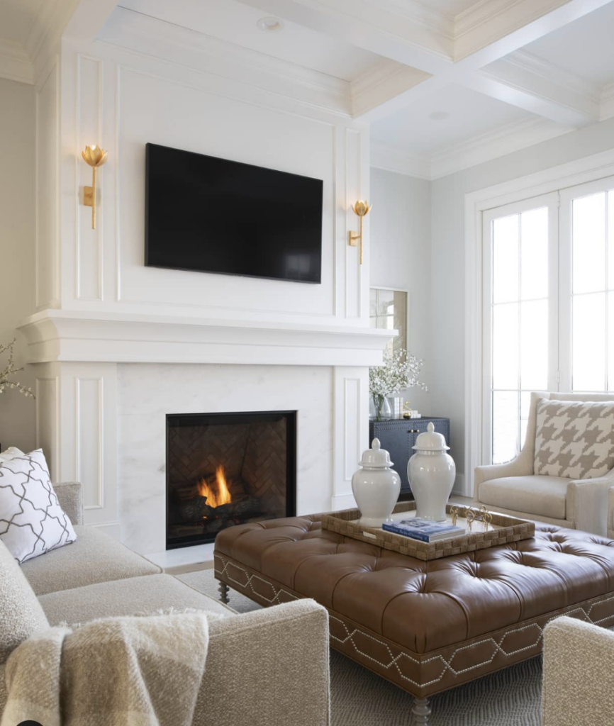 An off-white fireplace paired with sconces creates a harmonious blend of softness and sophistication. The neutral hue adds warmth while the lighting highlights architectural details with subtle charm. Perfect for both modern and transitional spaces, this combination brings depth, comfort, and a refined glow that elevates the ambiance of any living room.