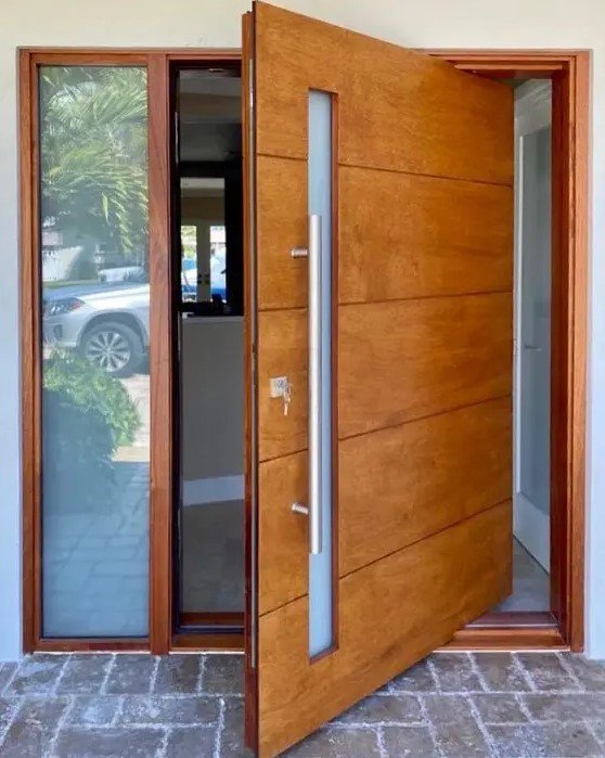Pivot doors are showstoppers. Instead of using side hinges, they rotate on a pivot system that gives a graceful swing. This design creates a luxurious and modern effect, especially for large entrances.