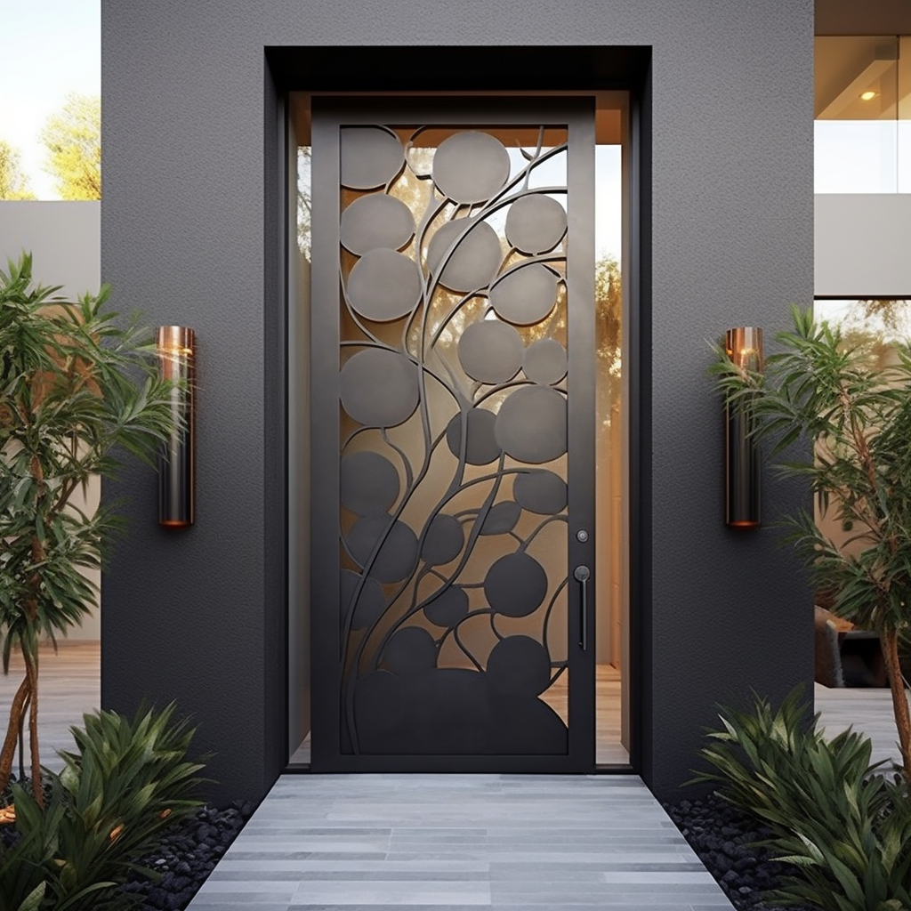 Colors like matte black, bronze, or graphite make the design bold. These doors often serve as main gates or exterior entrances, offering both security and beauty. The craftsmanship stands out without overpowering the home’s architecture.