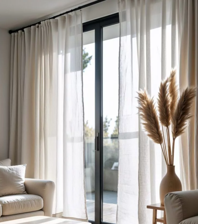 Linen curtains bring effortless charm to sliding glass doors, striking a balance between casual comfort and refined elegance. Their airy texture makes them an excellent fit for coastal, rustic, or Scandinavian-inspired interiors.